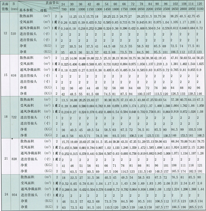 UⅡ型散熱排管有各種不同表面管長、管數(shù)、排數(shù)及翅片片距的多種配合,計有大小規(guī)格七百六十五種。